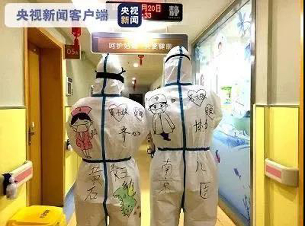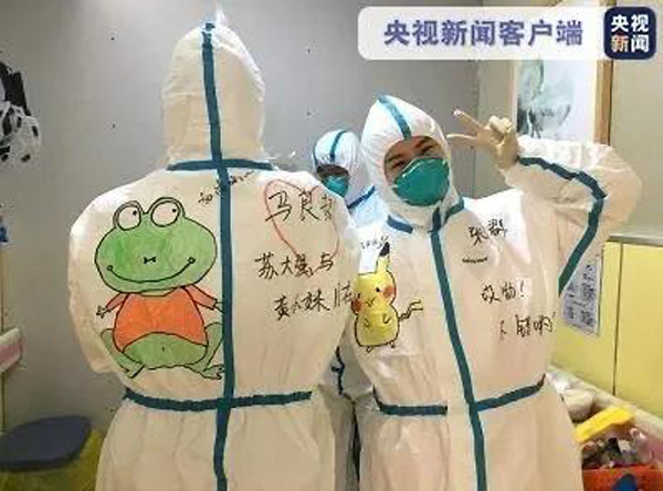 一幅幅充滿童趣的圖案,承載著醫(yī)護(hù)人員的愛心,沖淡了疫情給帶給孩子們的心理壓力,防護(hù)服隔離了病毒,卻沒有隔離愛。