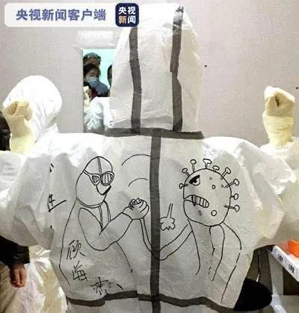 為消除孩子們的恐懼,護(hù)士在防護(hù)服上畫畫,這是江蘇支援黃石醫(yī)療隊隊員,南京市兒童醫(yī)院護(hù)士馬良超,進(jìn)入隔離區(qū)前拍攝的照片。